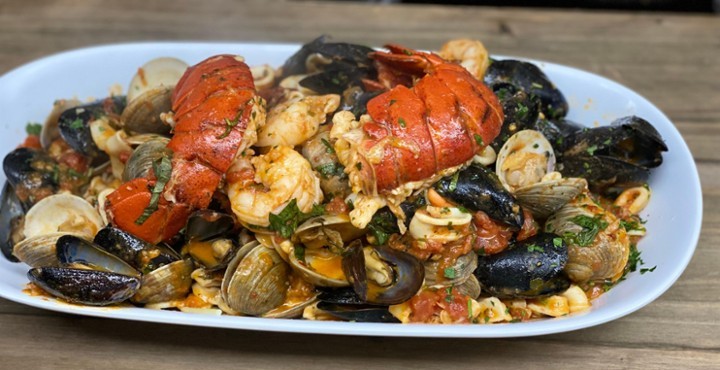 Mussels, clams, calamari, shrimp, lobster tail & garlic in a basil marinara sauce over linguine